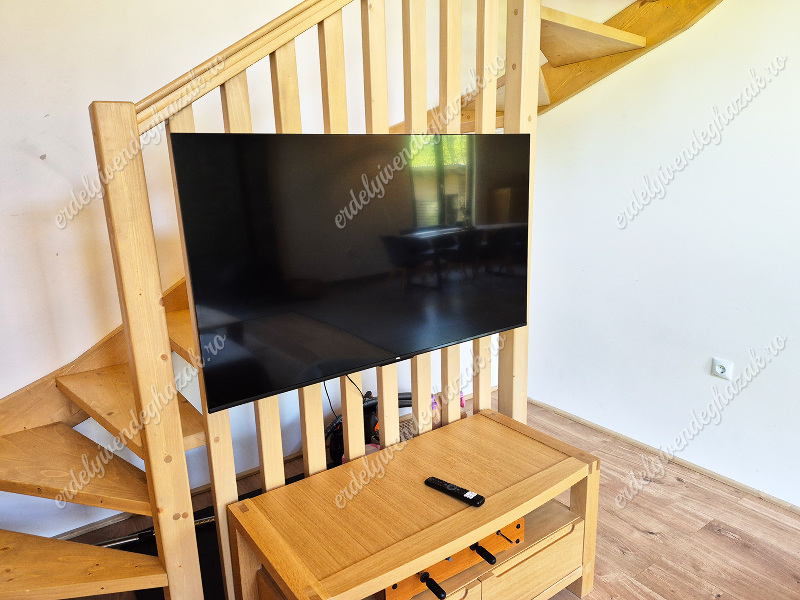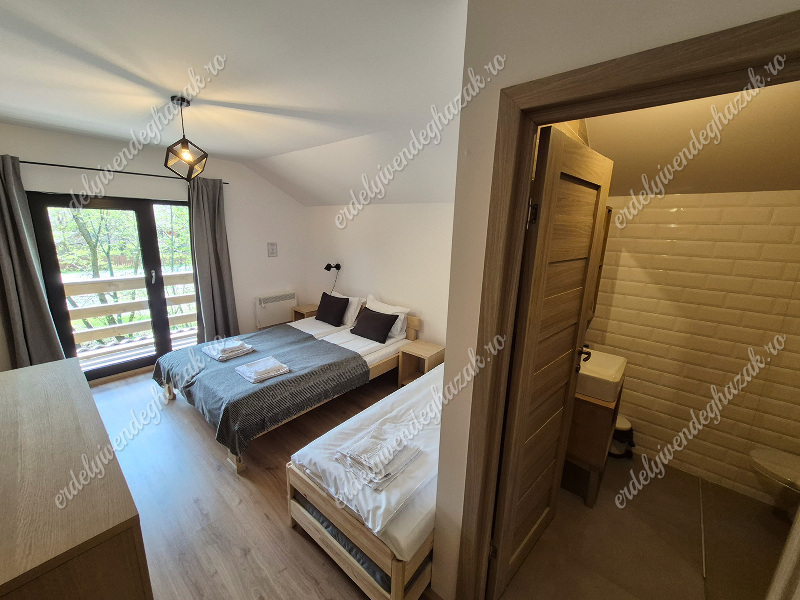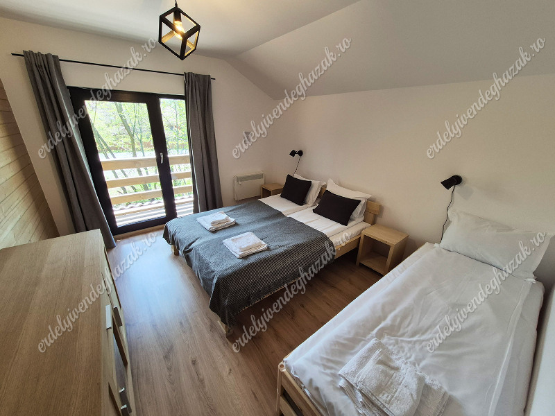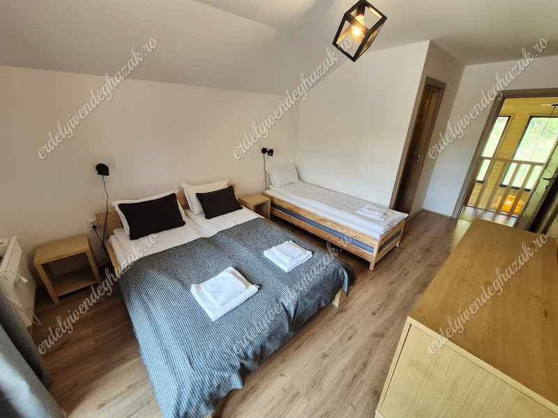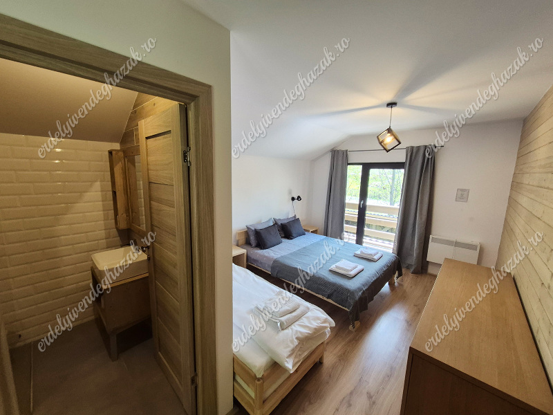 Az alsó szinten foglal helyet a nappali, az ebédlő a konyha és egy fürdőszoba. Ugyanitt egy franciaágyas szoba áll rendelkezésre. Az emeleten két szoba található. Mindkét szobában egy-egy franciaágy és két-két egyszemélyes pótágy található. Mindkét szobához saját fürdőszoba tartozik. (Összesen 6 + 4 fő!)